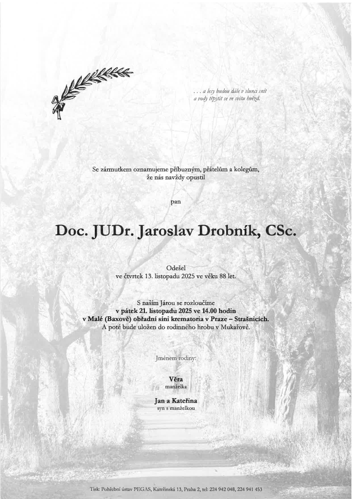 S hlubokým zármutkem oznamujeme, že ve věku 88 let odešel pan docent Jaroslav Drobník, čestný člen České společnosti pro právo životního prostředí.