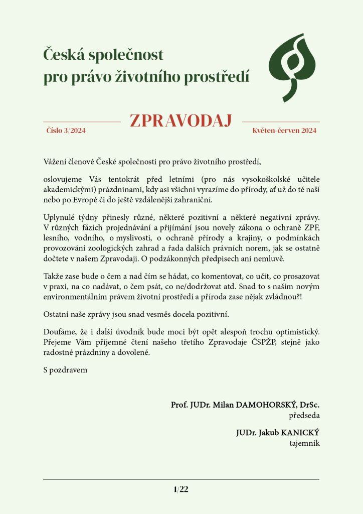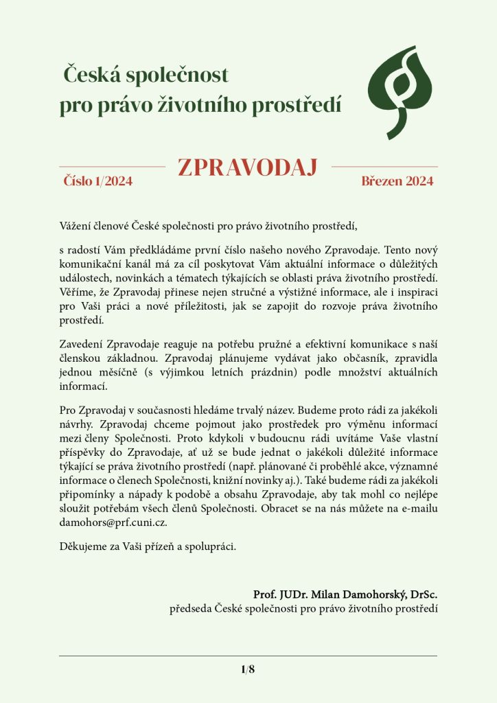 Představujeme zcela první číslo Zpravodaje České společnosti pro právo životního prostředí. Tento nový komunikační kanál má za cíl poskytovat Vám aktuální informace o důležitých událostech, novinkách a tématech týkajících se oblasti práva životního prostředí.