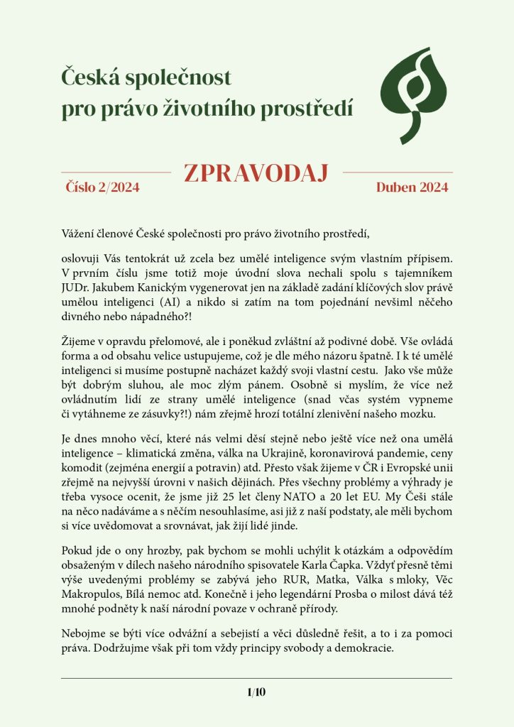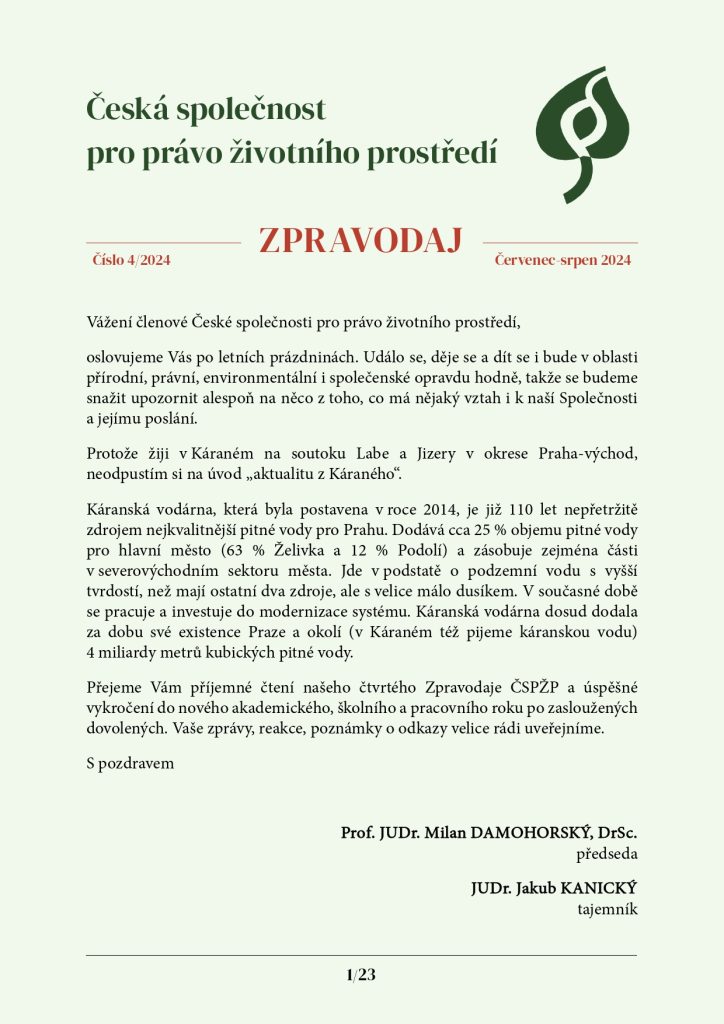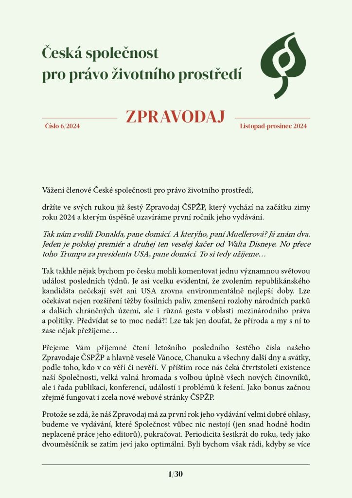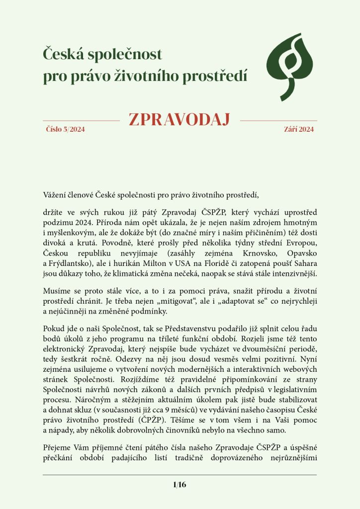 Další číslo Zpravodaje České společnosti pro právo životního prostředí shrnuje novinky na poli legislativy i judikatury za červenec a srpen 2024. Informujeme mj. o: