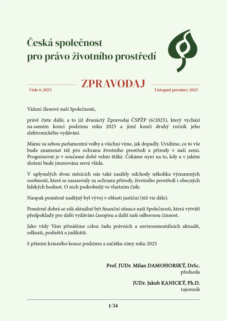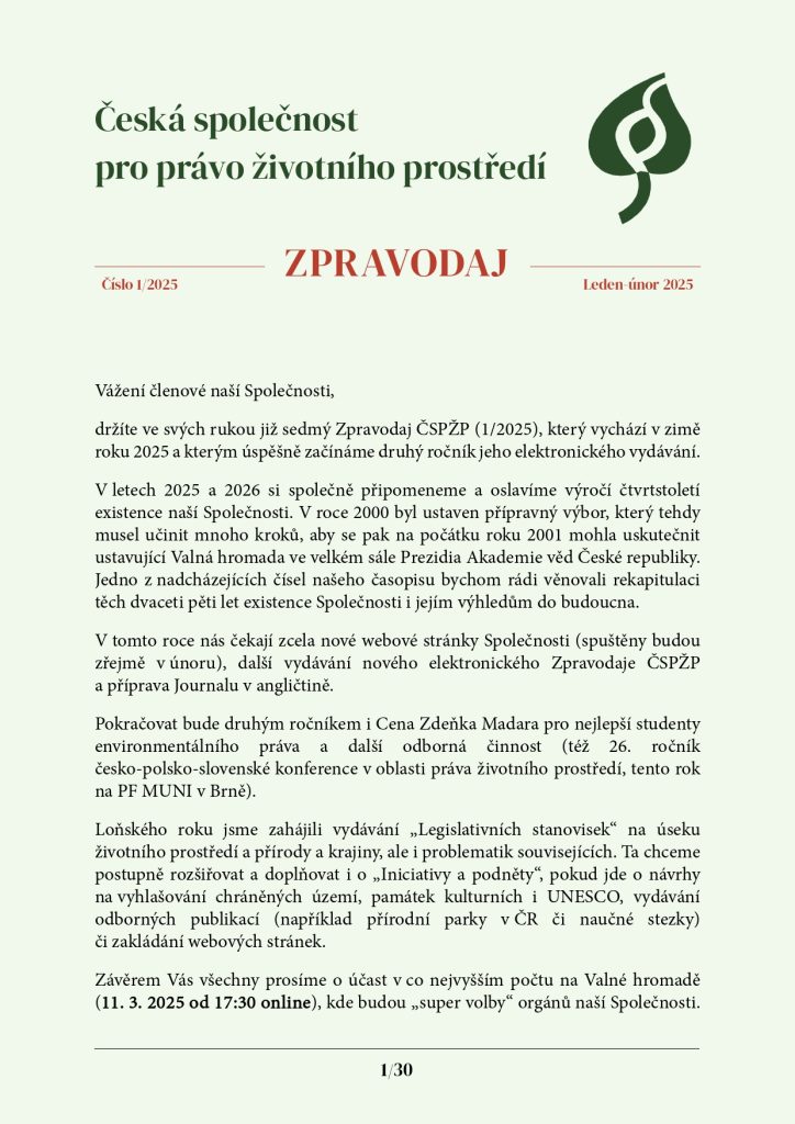 V prvním čísle Zpravodaje za rok 2025 přinášíme opět řadu nových informací z práva životního prostředí, např.: