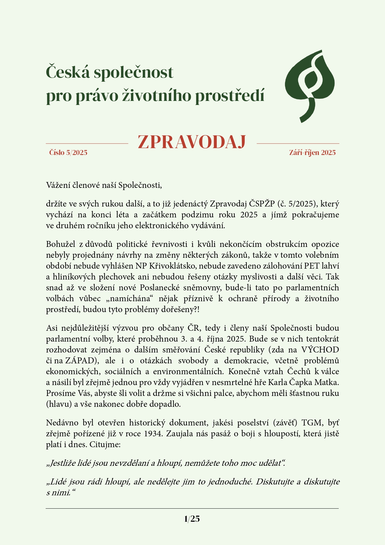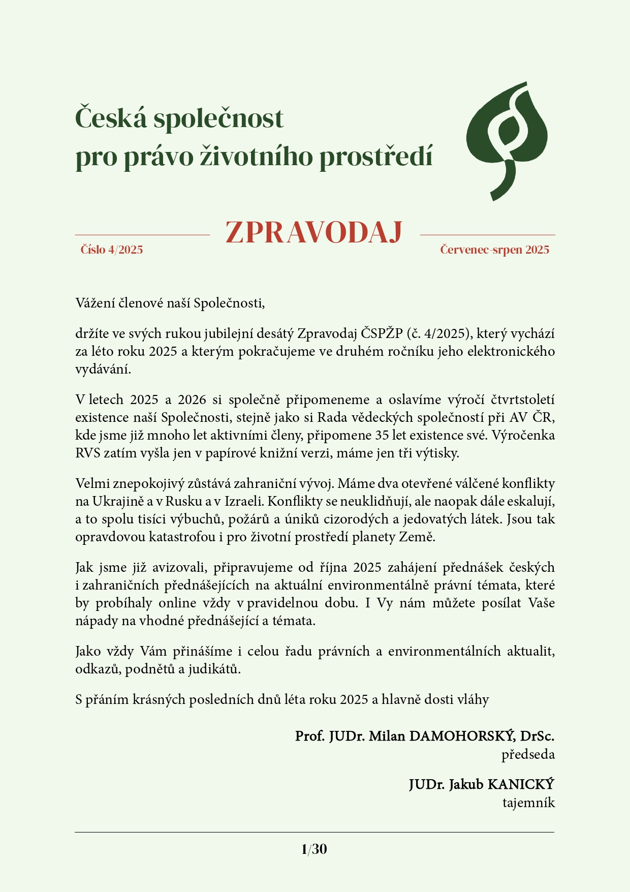 V prvním čísle Zpravodaje za rok 2025 přinášíme opět řadu nových informací z práva životního prostředí, např.: